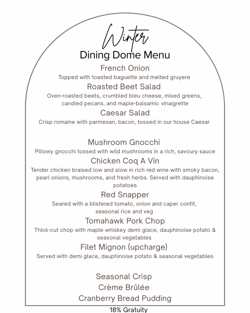 Experience winter dining like never before in our private, heated domes overlooking the marina. Cozy up under the glow of string lights and enjoy a curated three-course menu featuring elevated comfort food, craft cocktails, and stunning dockside views. Each dome offers a warm, intimate escape perfect for date nights, small gatherings, or special celebrations. Two seatings are available nightly at 5:30 PM and 7:30 PM, with advance reservations required. Come dine under the stars and make this season unforgettable at Harbour House.